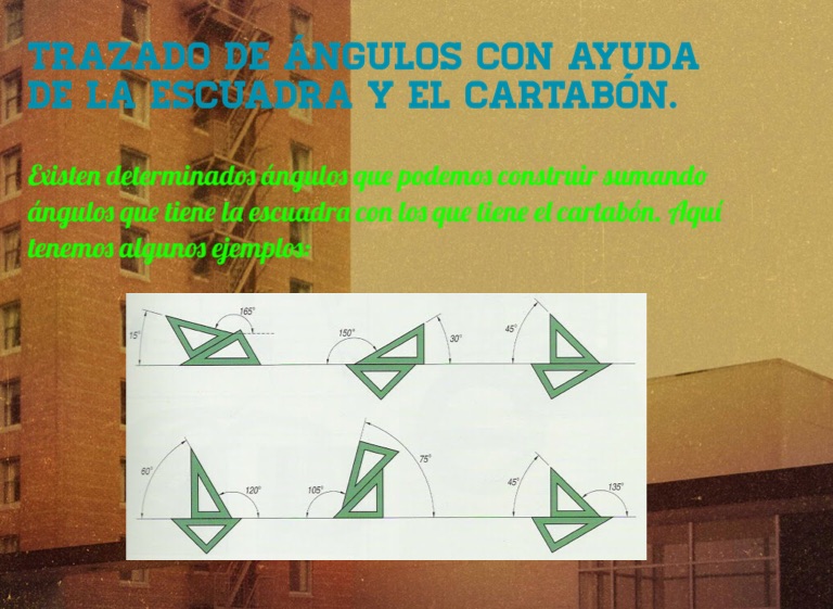 Existen determinados ángulos que podemos construir sumando ángulos que tiene la escuadra con los que tiene el cartabón. Aquí tenemos algunos ejemplos:
