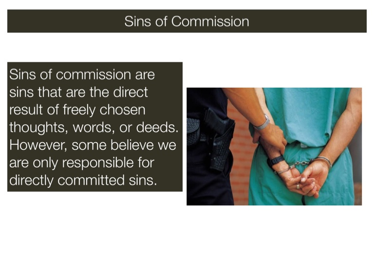 Sins of commission are sins that are the direct result of freely chosen thoughts, words, or deeds. However, some believe we are only responsible for directly committed sins.
