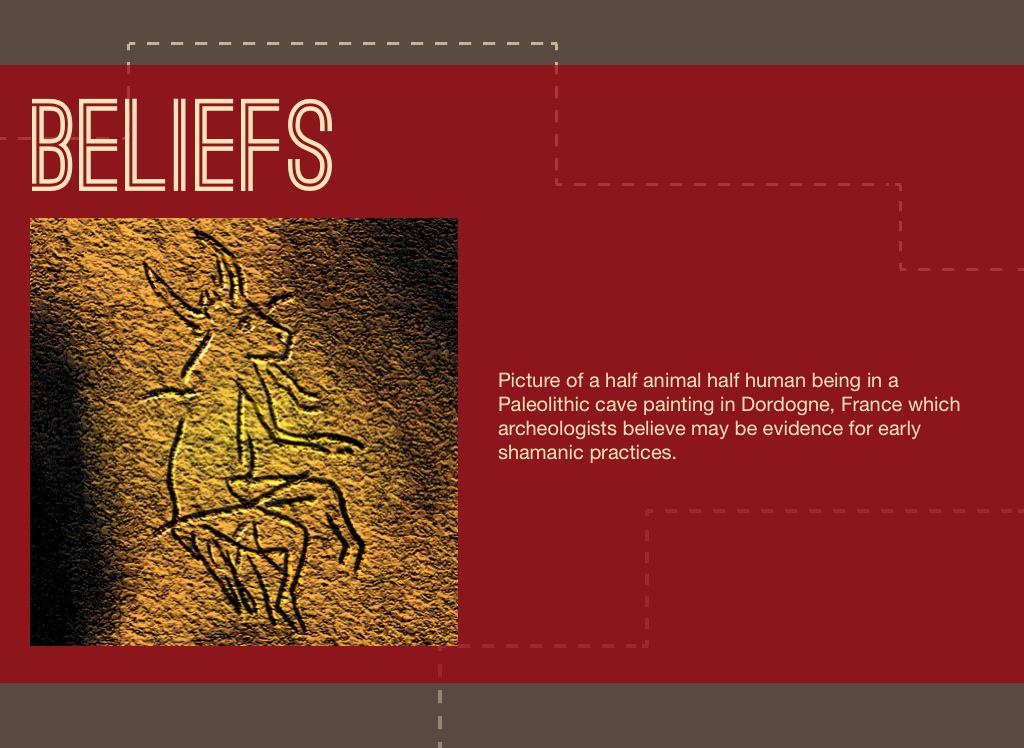 Picture of a half animal half human being in a Paleolithic cave painting in Dordogne, France which archeologists believe may be evidence for early shamanic practices.