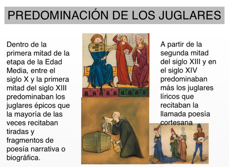 Dentro de la primera mitad de la etapa de la Edad Media, entre el siglo X y la primera mitad del siglo XIII predominaban los juglares épicos que la mayoría de las veces recitaban tiradas y fragmentos de poesía narrativa o biográfica.