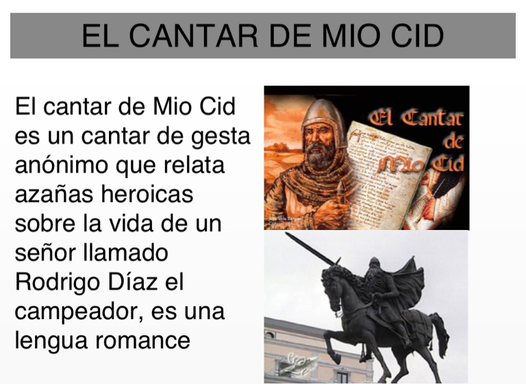 El cantar de Mio Cid es un cantar de gesta anónimo que relata azañas heroicas sobre la vida de un señor llamado Rodrigo Díaz el campeador, es una lengua romance