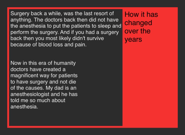 Now in this era of humanity doctors have created a magnificent way for patients to have surgery and not die of the causes. My dad is an anesthesiologist and he has told me so much about anesthesia.