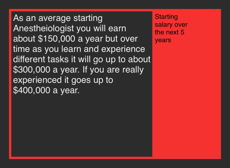 As an average starting Anestheiologist you will earn about $150,000 a year but over time as you learn and experience different tasks it will go up to about $300,000 a year. If you are really experienced it goes up to $400,000 a year.