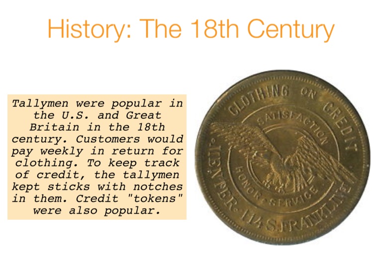 Tallymen were popular in the U.S. and Great Britain in the 18th century. Customers would pay weekly in return for clothing. To keep track of credit, the tallymen kept sticks with notches in them. Credit "tokens" were also popular.