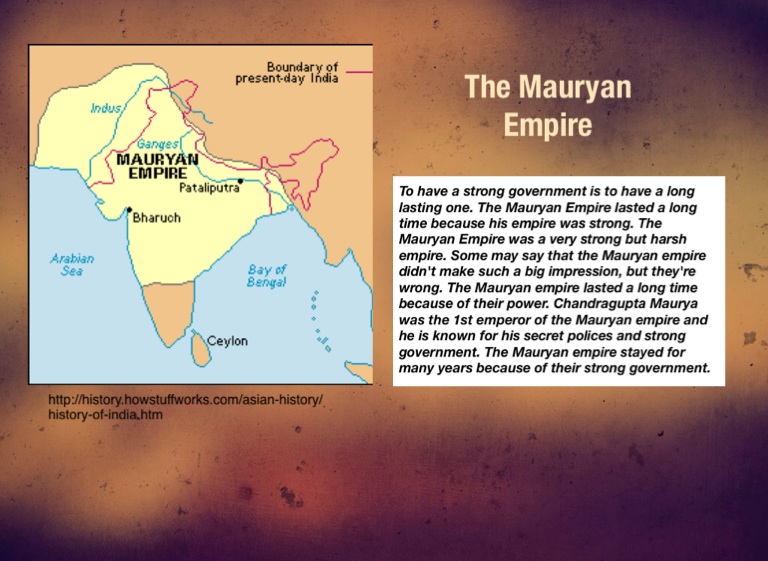 To have a strong government is to have a long lasting one. The Mauryan Empire lasted a long time because his empire was strong. The Mauryan Empire was a very strong but harsh empire. Some may say that the Mauryan empire didn't make such a big impression, but they're wrong. The Mauryan empire lasted a long time because of their power. Chandragupta Maurya was the 1st emperor of the Mauryan empire and he is known for his secret polices and strong government. The Mauryan empire stayed for many years because of their strong government.
