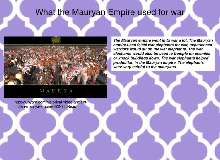 The Mauryan empire went in to war a lot. The Mauryan empire used 9,000 war elephants for war, experienced warriors would sit on the war elephants. The war elephants would also be used to trample on enemies or knock buildings down. The war elephants helped production in the Mauryan empire. The elephants were very helpful to the mauryans.