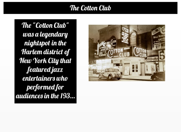 The "Cotton Club" was a legendary nightspot in the Harlem district of New York City that featured jazz entertainers who performed for audiences in the 1930's