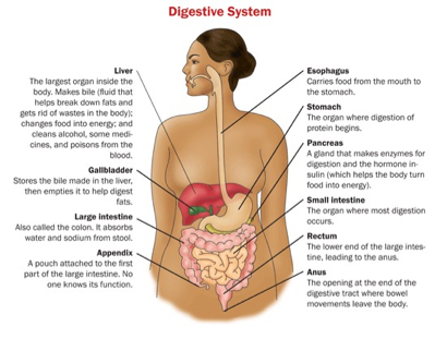 I saw the horror of my soon to be fate. These sharp white things (teeth) were grinding me up mechanically into a ball of food, a strong pink thing (tongue) touching me, and a bunch of salivary glands all over me. He eventually broke my shell and I fell through this long tube-like opening (esophagus) made of spongy material. Than I got a massage from these muscular contractions (peristalsis), and I fell into this dark balloon-shaped figure (stomach). At first, I thought this was a spa, but then I started to chemically turn into this milkshake like substance (chyme) I could see this ruff yellow object (pancreas) adding digestive chemical as I left the stomach.