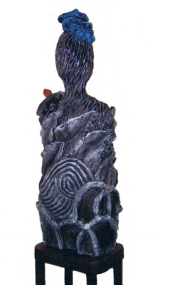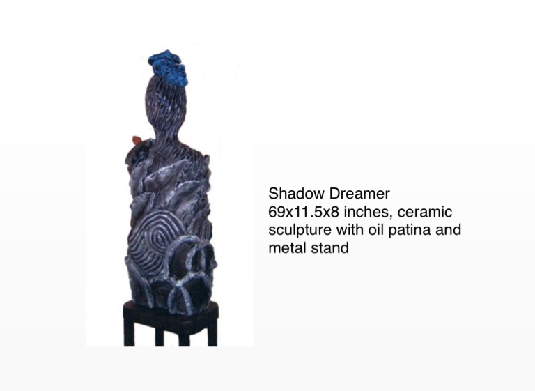 69x11.5x8 inches, ceramic sculpture with oil patina and metal stand