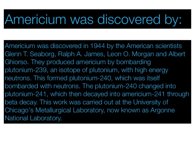 Americium was discovered in 1944 by the American scientists Glenn T. Seaborg, Ralph A. James, Leon O. Morgan and Albert Ghiorso. They produced americium by bombarding plutonium-239, an isotope of plutonium, with high energy neutrons. This formed plutonium-240, which was itself bombarded with neutrons. The plutonium-240 changed into plutonium-241, which then decayed into americium-241 through beta decay. This work was carried out at the University of Chicago's Metallurgical Laboratory, now known as Argonne National Laboratory.