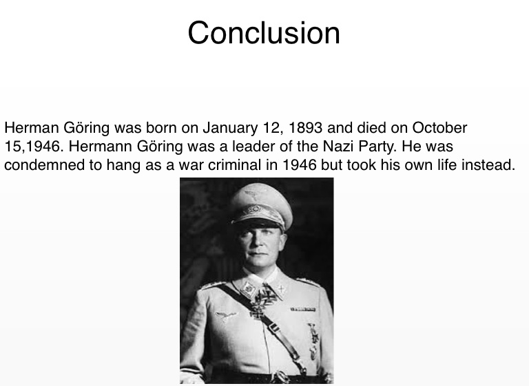 Herman Göring was born on January 12, 1893 and died on October 15,1946. Hermann Göring was a leader of the Nazi Party. He was condemned to hang as a war criminal in 1946 but took his own life instead.