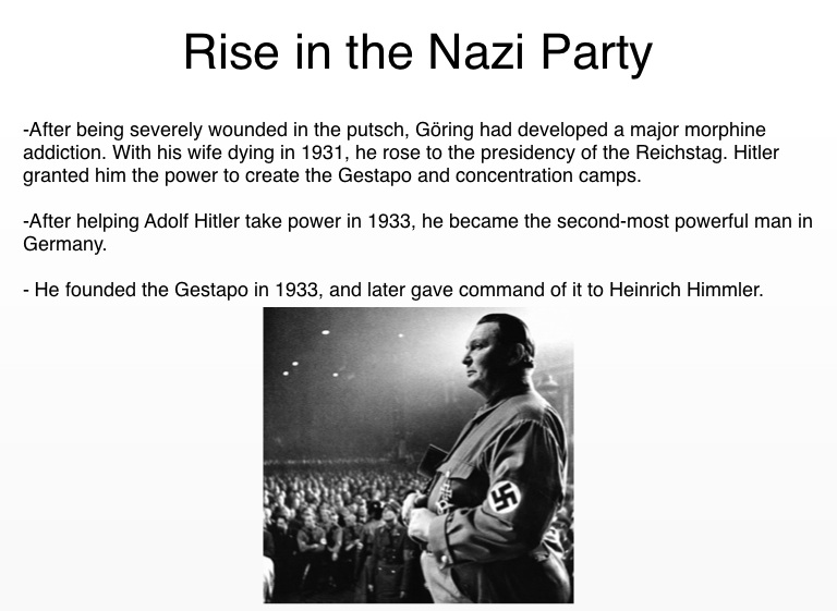 -After being severely wounded in the putsch, Göring had developed a major morphine addiction. With his wife dying in 1931, he rose to the presidency of the Reichstag. Hitler granted him the power to create the Gestapo and concentration camps.