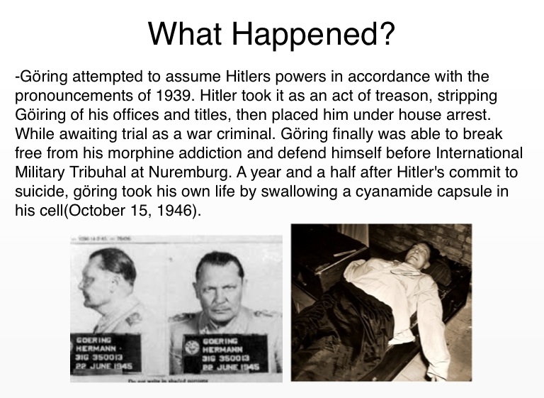 -Göring attempted to assume Hitlers powers in accordance with the pronouncements of 1939. Hitler took it as an act of treason, stripping Göiring of his offices and titles, then placed him under house arrest. While awaiting trial as a war criminal. Göring finally was able to break free from his morphine addiction and defend himself before International Military Tribuhal at Nuremburg. A year and a half after Hitler's commit to suicide, göring took his own life by swallowing a cyanamide capsule in his cell(October 15, 1946).