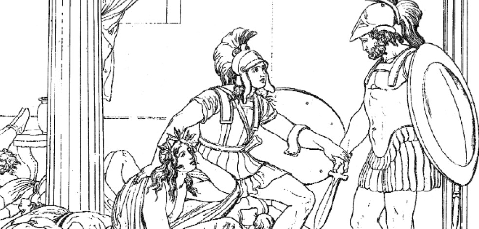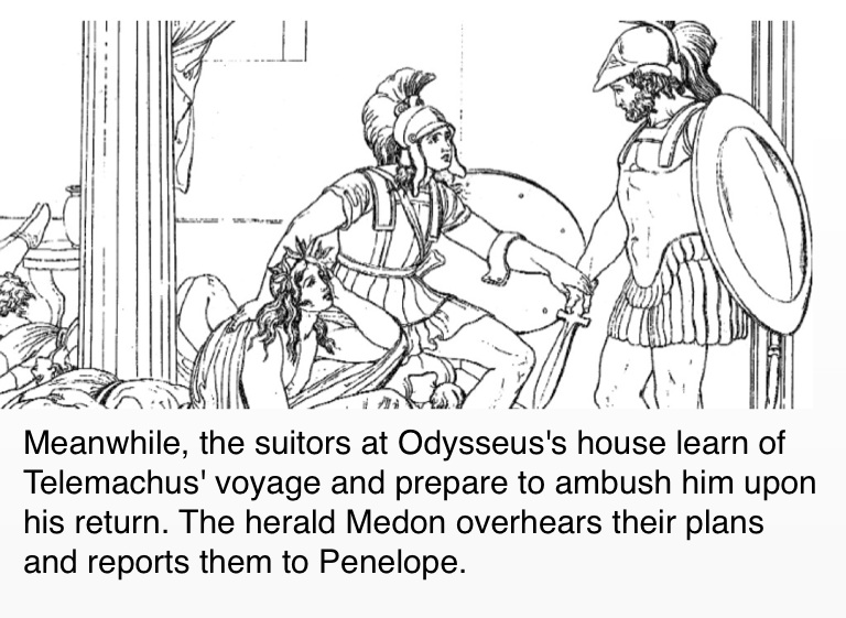 Meanwhile, the suitors at Odysseus's house learn of Telemachus' voyage and prepare to ambush him upon his return. The herald Medon overhears their plans and reports them to Penelope.