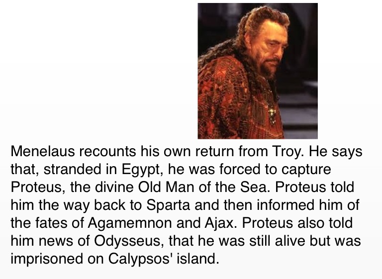 Menelaus recounts his own return from Troy. He says that, stranded in Egypt, he was forced to capture Proteus, the divine Old Man of the Sea. Proteus told him the way back to Sparta and then informed him of the fates of Agamemnon and Ajax. Proteus also told him news of Odysseus, that he was still alive but was imprisoned on Calypsos' island.