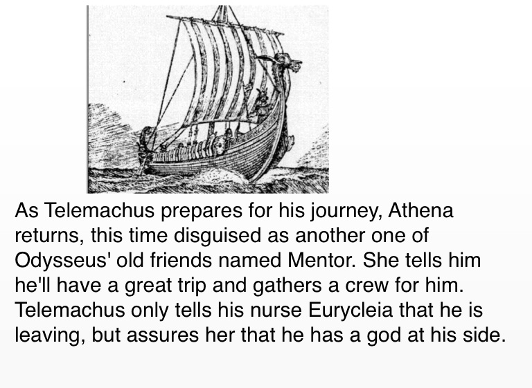 As Telemachus prepares for his journey, Athena returns, this time disguised as another one of Odysseus' old friends named Mentor. She tells him he'll have a great trip and gathers a crew for him. Telemachus only tells his nurse Eurycleia that he is leaving, but assures her that he has a god at his side.