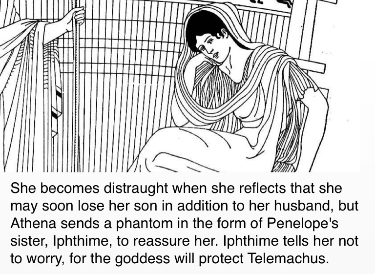 She becomes distraught when she reflects that she may soon lose her son in addition to her husband, but Athena sends a phantom in the form of Penelope's sister, Iphthime, to reassure her. Iphthime tells her not to worry, for the goddess will protect Telemachus.