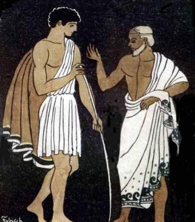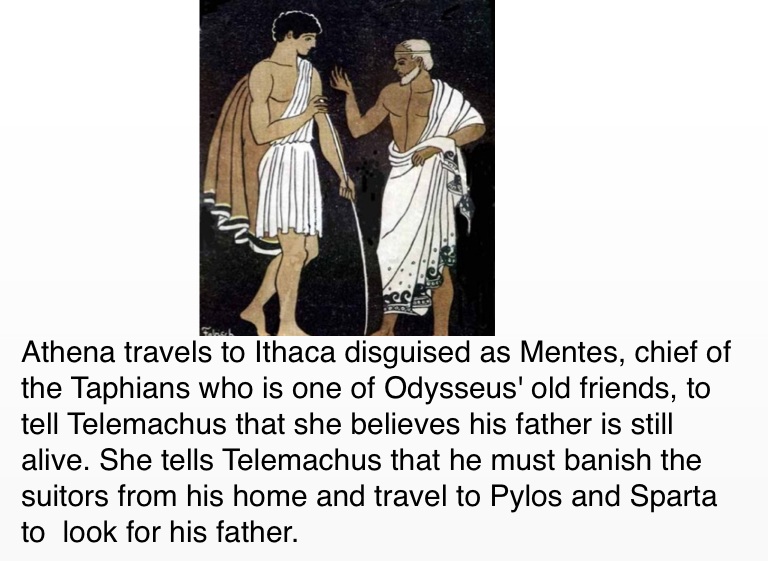 Athena travels to Ithaca disguised as Mentes, chief of the Taphians who is one of Odysseus' old friends, to tell Telemachus that she believes his father is still alive. She tells Telemachus that he must banish the suitors from his home and travel to Pylos and Sparta to look for his father.