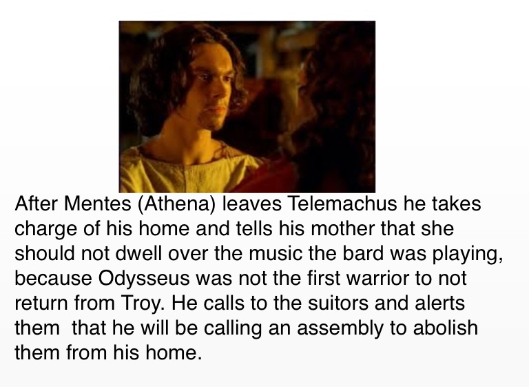 After Mentes (Athena) leaves Telemachus he takes charge of his home and tells his mother that she should not dwell over the music the bard was playing, because Odysseus was not the first warrior to not return from Troy. He calls to the suitors and alerts them that he will be calling an assembly to abolish them from his home.
