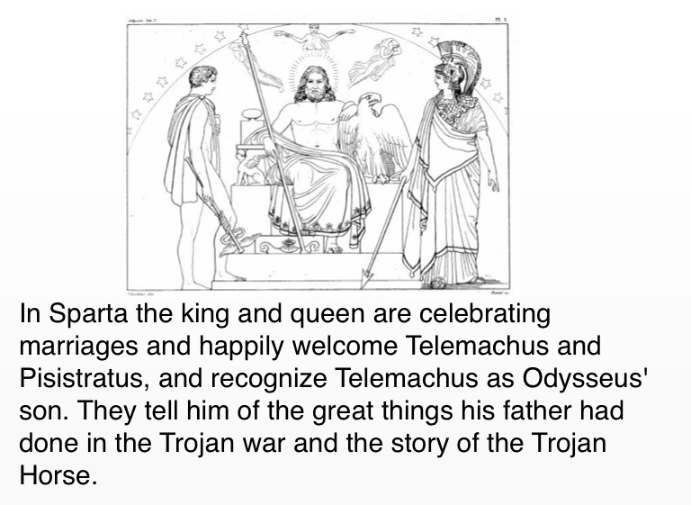 In Sparta the king and queen are celebrating marriages and happily welcome Telemachus and Pisistratus, and recognize Telemachus as Odysseus' son. They tell him of the great things his father had done in the Trojan war and the story of the Trojan Horse.