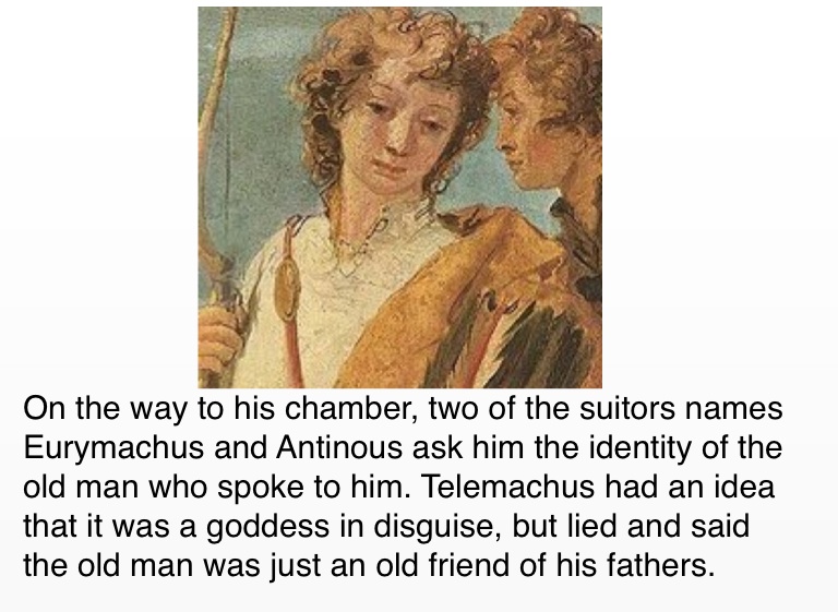 On the way to his chamber, two of the suitors names Eurymachus and Antinous ask him the identity of the old man who spoke to him. Telemachus had an idea that it was a goddess in disguise, but lied and said the old man was just an old friend of his fathers.