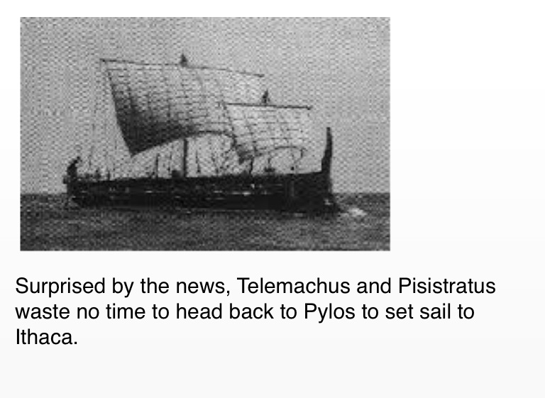 Surprised by the news, Telemachus and Pisistratus waste no time to head back to Pylos to set sail to Ithaca.
