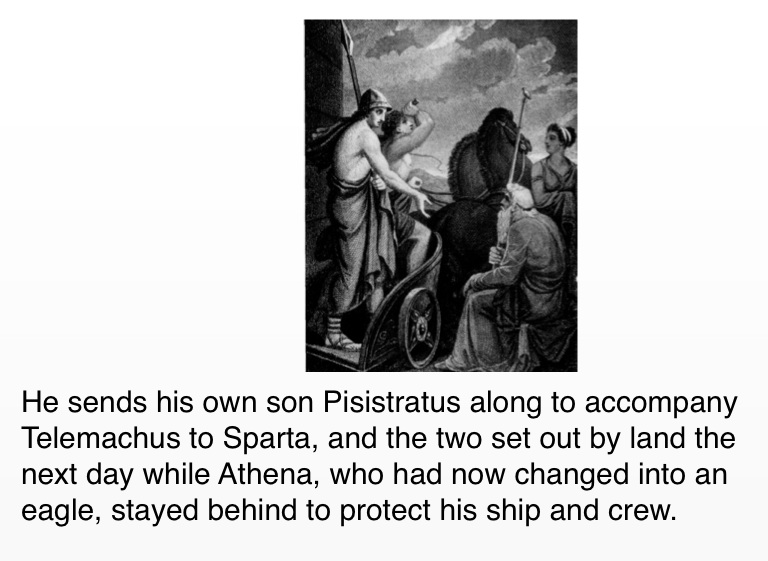 He sends his own son Pisistratus along to accompany Telemachus to Sparta, and the two set out by land the next day while Athena, who had now changed into an eagle, stayed behind to protect his ship and crew.