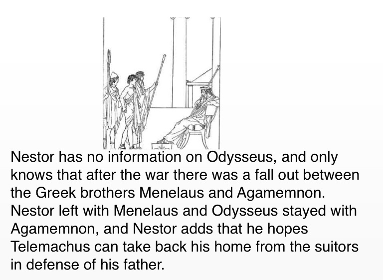 Nestor has no information on Odysseus, and only knows that after the war there was a fall out between the Greek brothers Menelaus and Agamemnon. Nestor left with Menelaus and Odysseus stayed with Agamemnon, and Nestor adds that he hopes Telemachus can take back his home from the suitors in defense of his father.