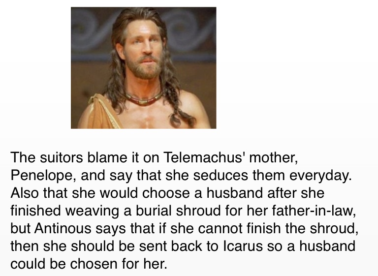 The suitors blame it on Telemachus' mother, Penelope, and say that she seduces them everyday. Also that she would choose a husband after she finished weaving a burial shroud for her father-in-law, but Antinous says that if she cannot finish the shroud, then she should be sent back to Icarus so a husband could be chosen for her.