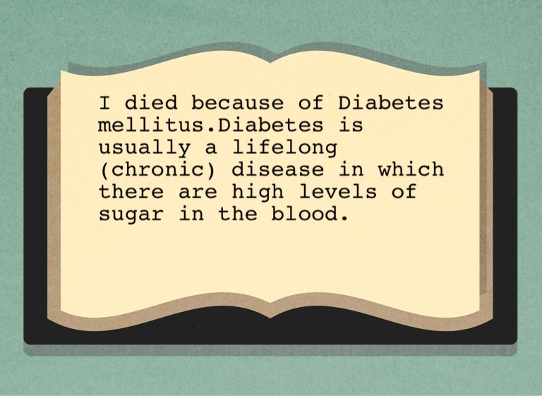 I died because of Diabetes mellitus.Diabetes is usually a lifelong (chronic) disease in which there are high levels of sugar in the blood.