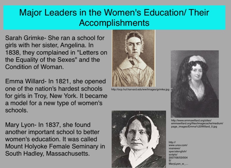 Mary Lyon- In 1837, she found another important school to better women's education. It was called Mount Holyoke Female Seminary in South Hadley, Massachusetts.