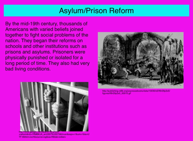 By the mid-19th century, thousands of Americans with varied beliefs joined together to fight social problems of the nation. They began their reforms on schools and other institutions such as prisons and asylums. Prisoners were physically punished or isolated for a long period of time. They also had very bad living conditions.