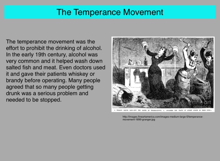 The temperance movement was the effort to prohibit the drinking of alcohol. In the early 19th century, alcohol was very common and it helped wash down salted fish and meat. Even doctors used it and gave their patients whiskey or brandy before operating. Many people agreed that so many people getting drunk was a serious problem and needed to be stopped.