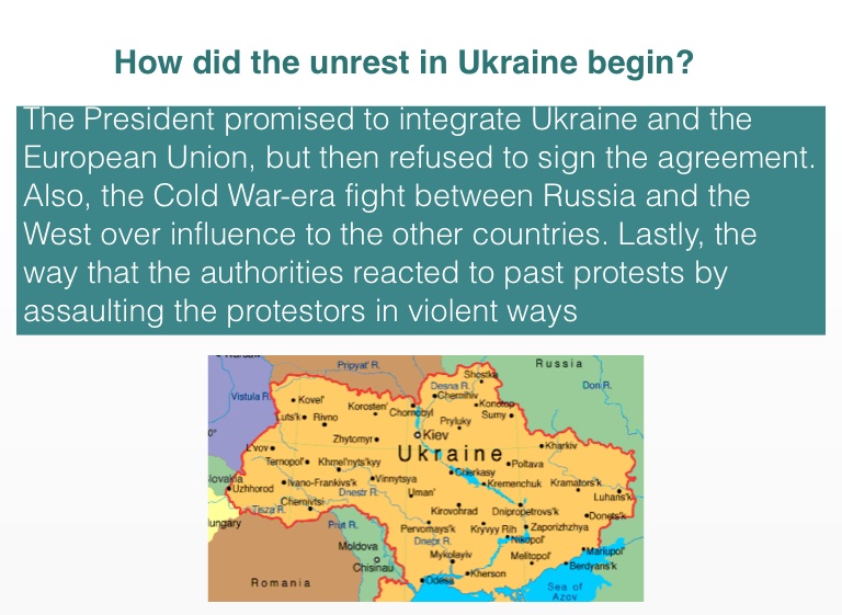 The President promised to integrate Ukraine and the European Union, but then refused to sign the agreement. Also, the Cold War-era fight between Russia and the West over influence to the other countries. Lastly, the way that the authorities reacted to past protests by assaulting the protestors in violent ways