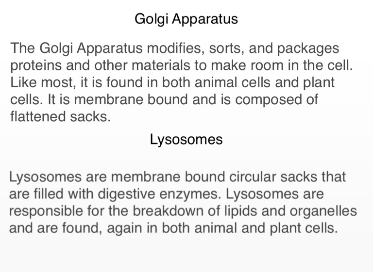 The Golgi Apparatus modifies, sorts, and packages proteins and other materials to make room in the cell. Like most, it is found in both animal cells and plant cells. It is membrane bound and is composed of flattened sacks.