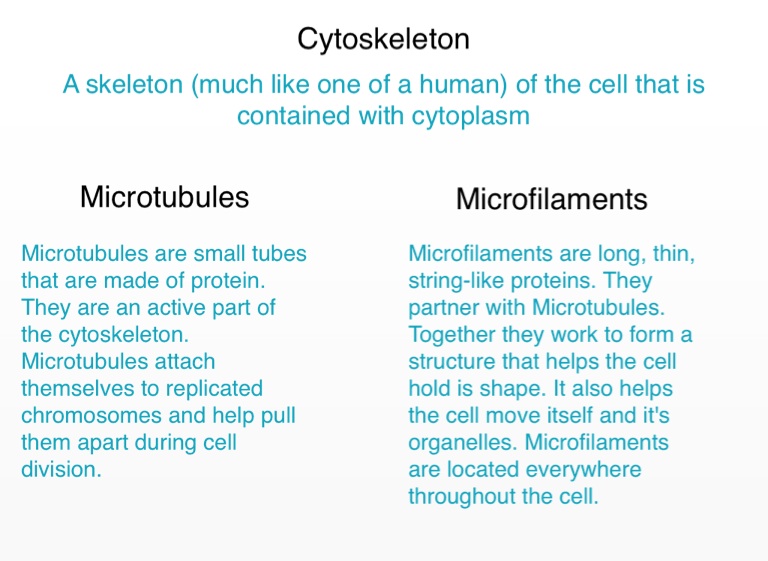 Microfilaments are long, thin, string-like proteins. They partner with Microtubules. Together they work to form a structure that helps the cell hold is shape. It also helps the cell move itself and it's organelles. Microfilaments are located everywhere throughout the cell.