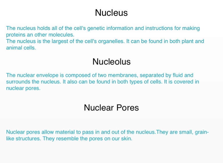Nuclear pores allow material to pass in and out of the nucleus.They are small, grain-like structures. They resemble the pores on our skin.