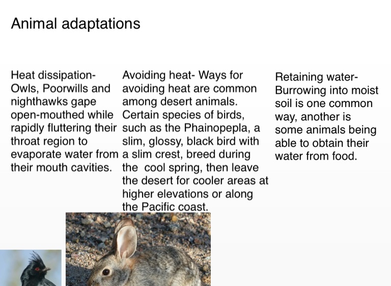 Avoiding heat- Ways for avoiding heat are common among desert animals. Certain species of birds, such as the Phainopepla, a slim, glossy, black bird with a slim crest, breed during the cool spring, then leave the desert for cooler areas at higher elevations or along the Pacific coast.