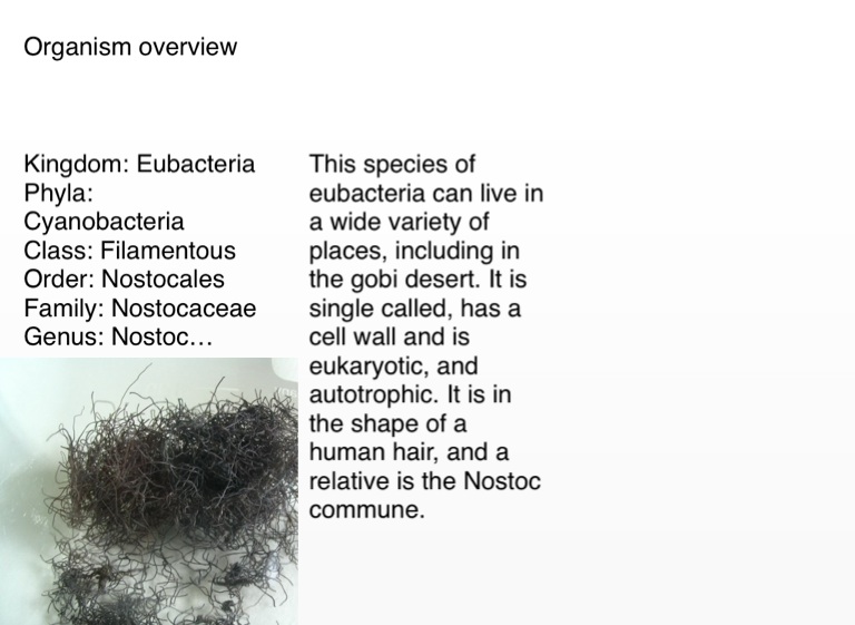 This species of eubacteria can live in a wide variety of places, including in the gobi desert. It is single called, has a cell wall and is eukaryotic, and autotrophic. It is in the shape of a human hair, and a relative is the Nostoc commune.