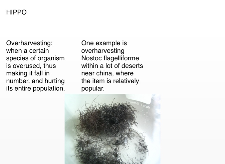 Overharvesting: when a certain species of organism is overused, thus making it fall in number, and hurting its entire population.