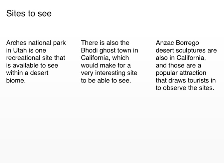 Arches national park in Utah is one recreational site that is available to see within a desert biome.