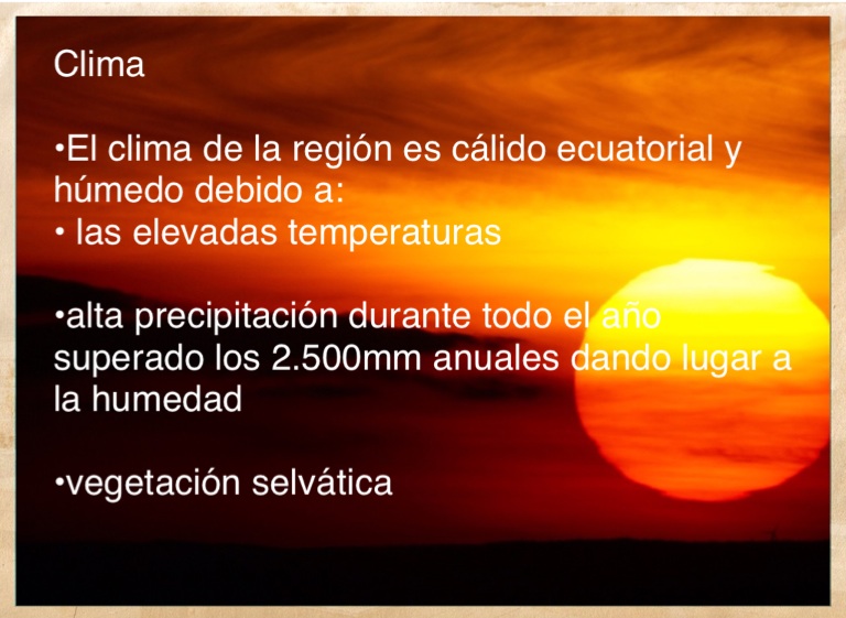 •El clima de la región es cálido ecuatorial y húmedo debido a: