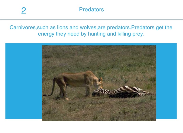Carnivores,such as lions and wolves,are predators.Predators get the energy they need by hunting and killing prey.