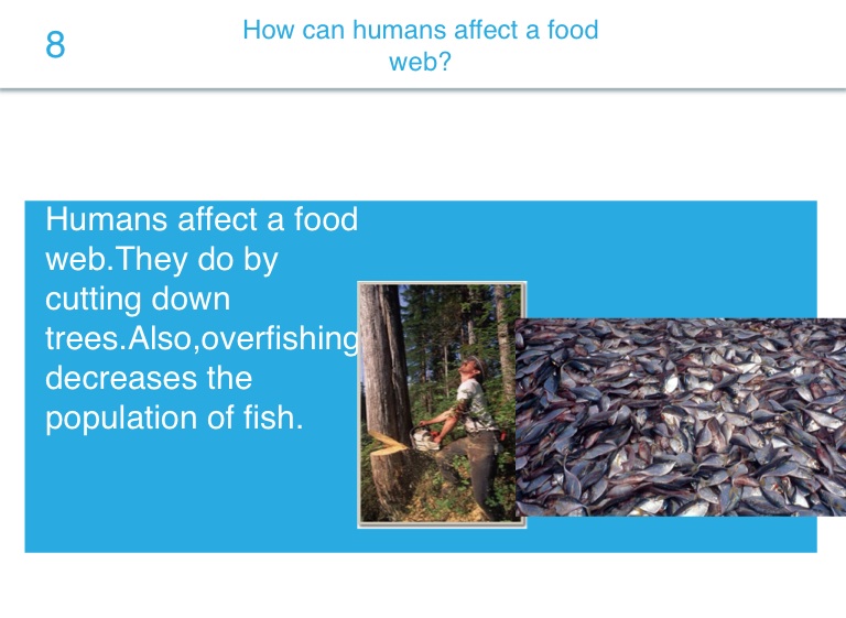 Humans affect a food web.They do by cutting down trees.Also,overfishing decreases the population of fish.