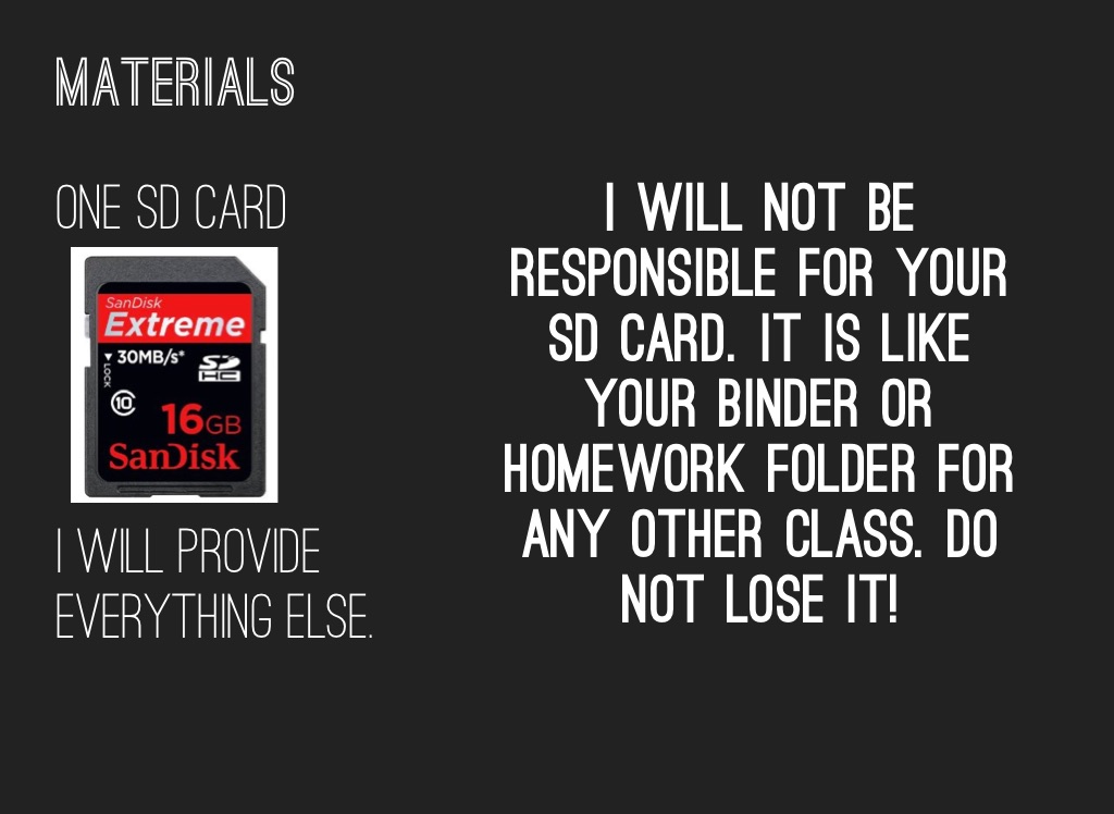 i will not be responsible for your sd card. It is like your binder or homework folder for any other class. do not lose it!