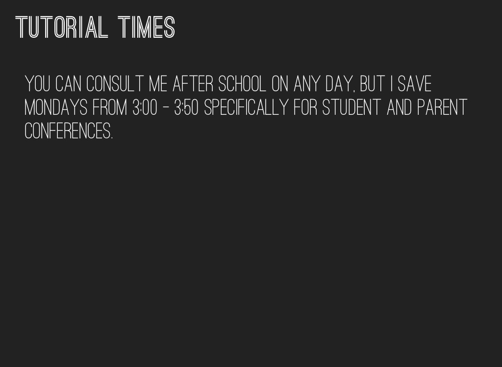you can consult me after school on any day, but I save Mondays from 3:00 - 3:50 specifically for student and parent conferences.