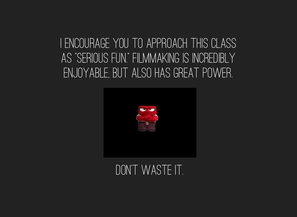 I encourage you to approach this class as “serious fun.” Filmmaking is incredibly enjoyable, but also has great power.