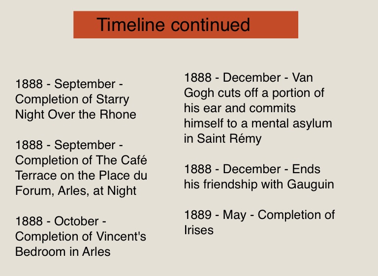 1888 - December - Van Gogh cuts off a portion of his ear and commits himself to a mental asylum in Saint Rémy