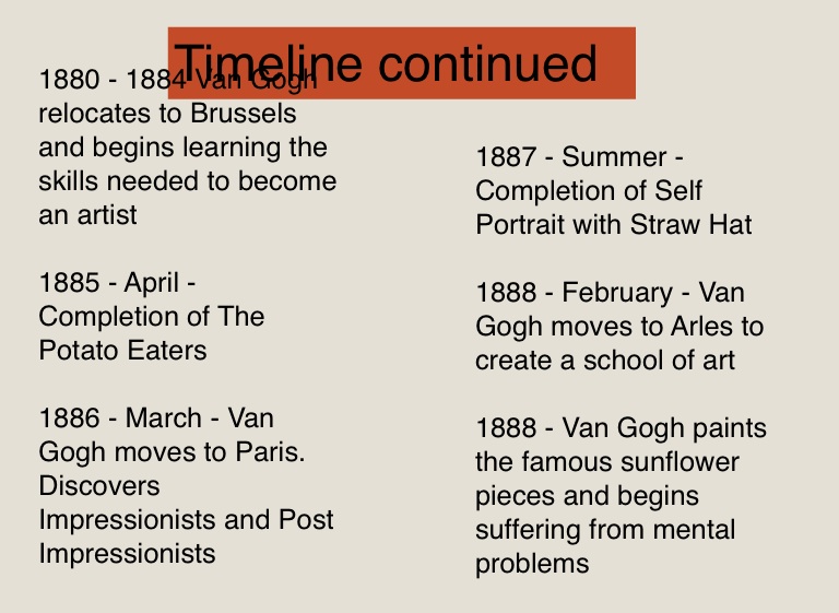 1880 - 1884 Van Gogh relocates to Brussels and begins learning the skills needed to become an artist