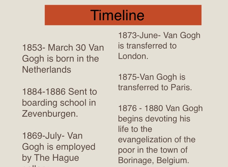 1876 - 1880 Van Gogh begins devoting his life to the evangelization of the poor in the town of Borinage, Belgium.
